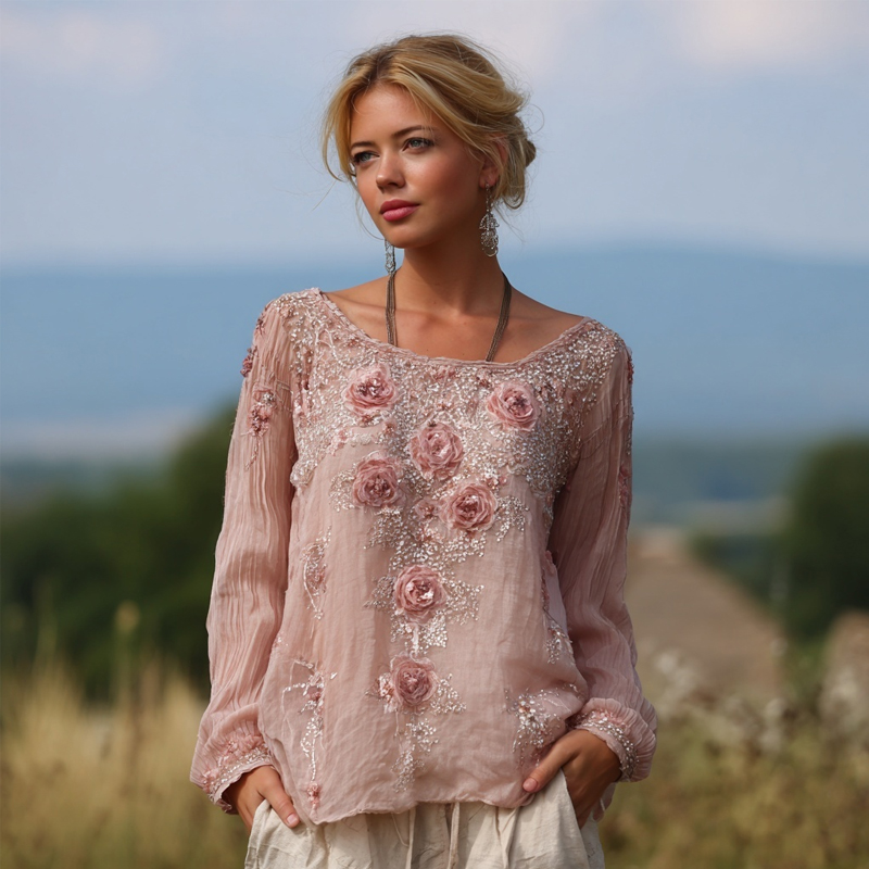 Bohemian Style Round Neck Long Sleeve 3d Floral Design Women's Top