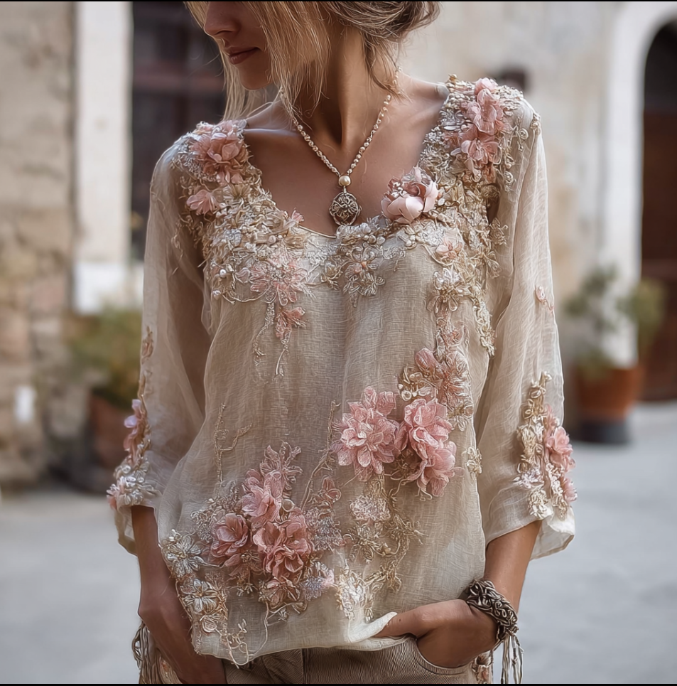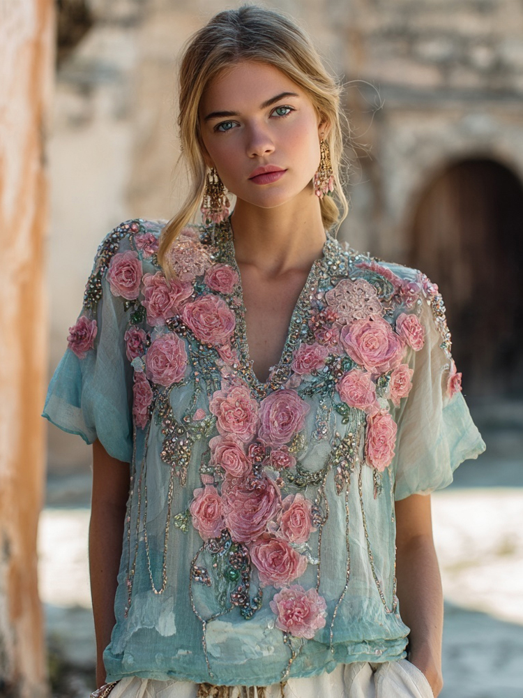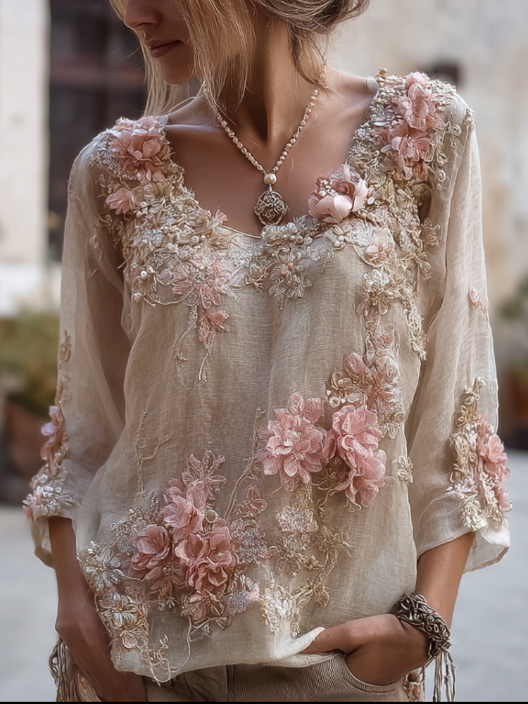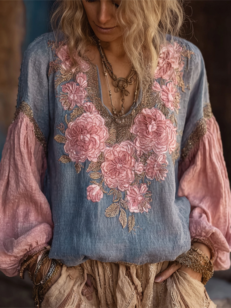 Boho Pink Roses Glitter Embroidered V Neck Linen Shirt