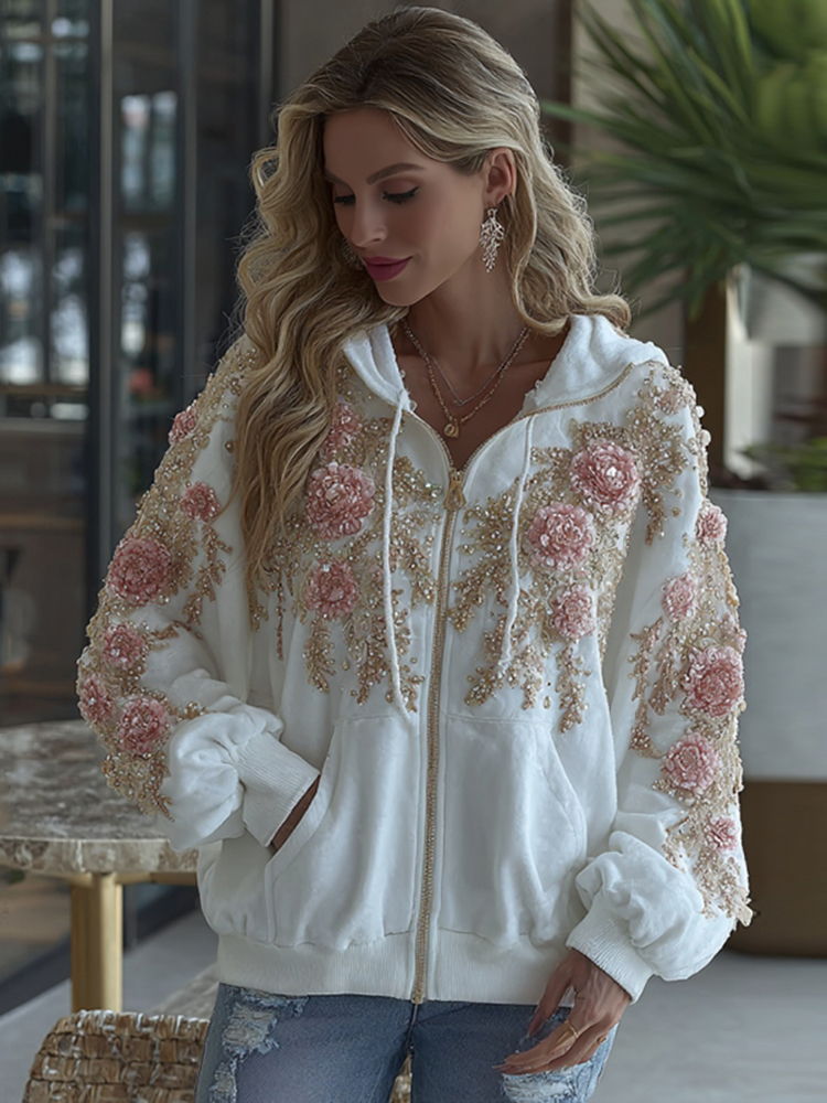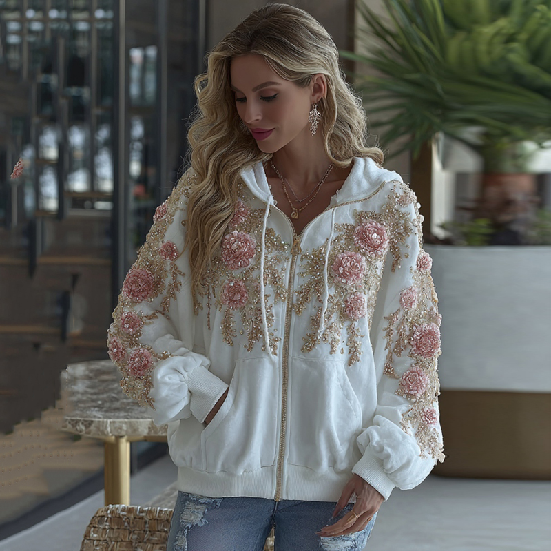 Women's Vintage Rose Floral Patchwork Cozy Warm Zipper Hoodie