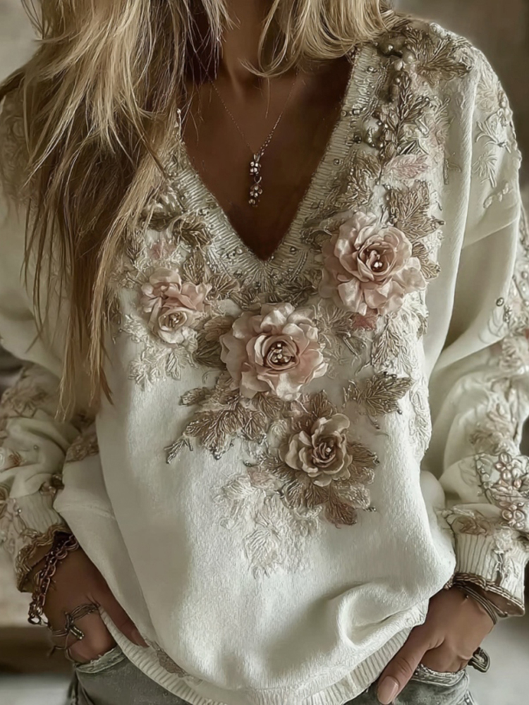 Women's Vintage Pink Rose Embroidered V-neck Long Sleeve Sweatshirt