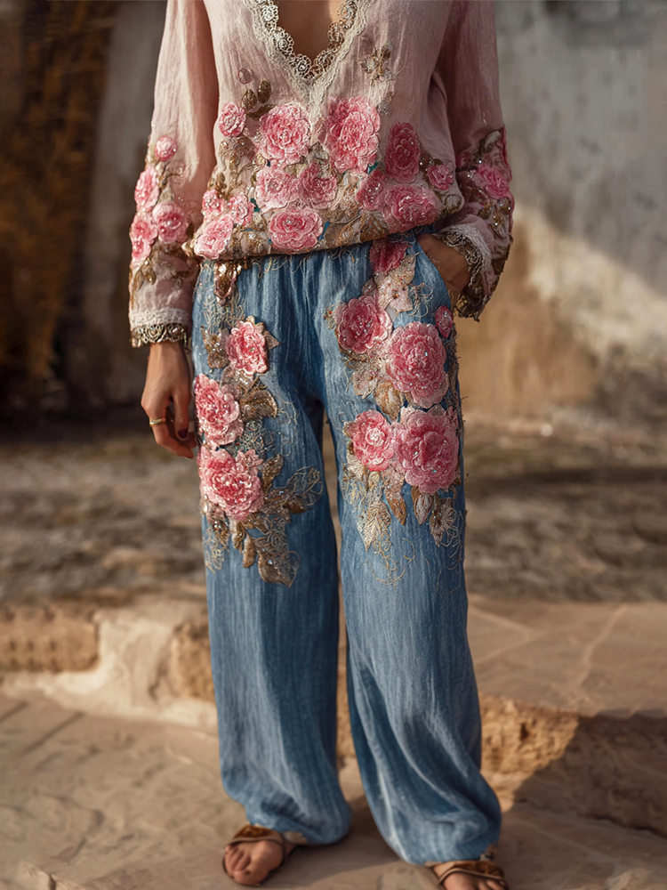 Vintage Boho Floral Embroidered Art Women's Linen Trousers