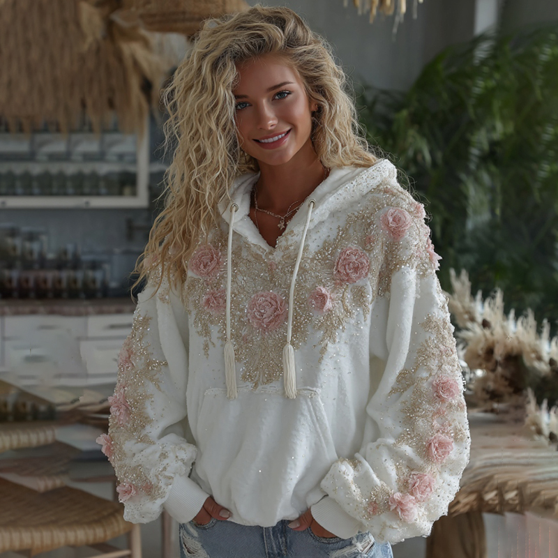 Vintage Pink Floral Embroidery Art Warm Hooded Sweatshirt